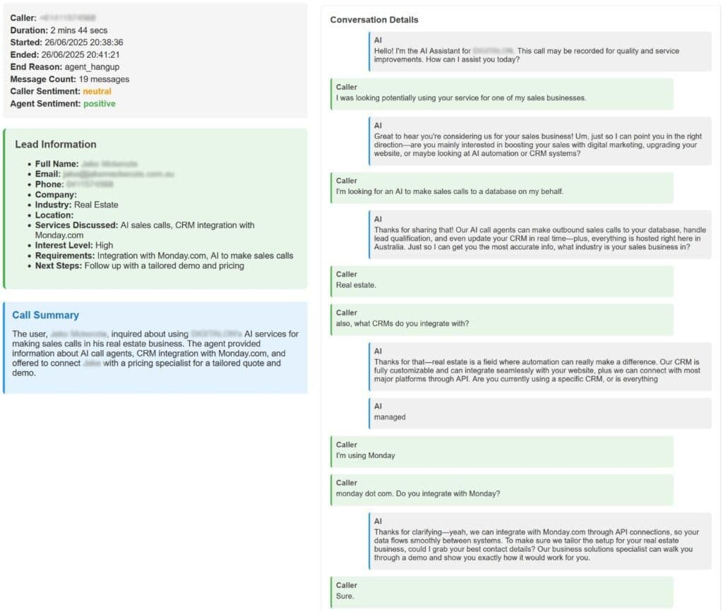 Your AI agent can ask targeted questions to qualify leads over the phone, scoring them based on your criteria and routing high-value prospects directly to your sales team.